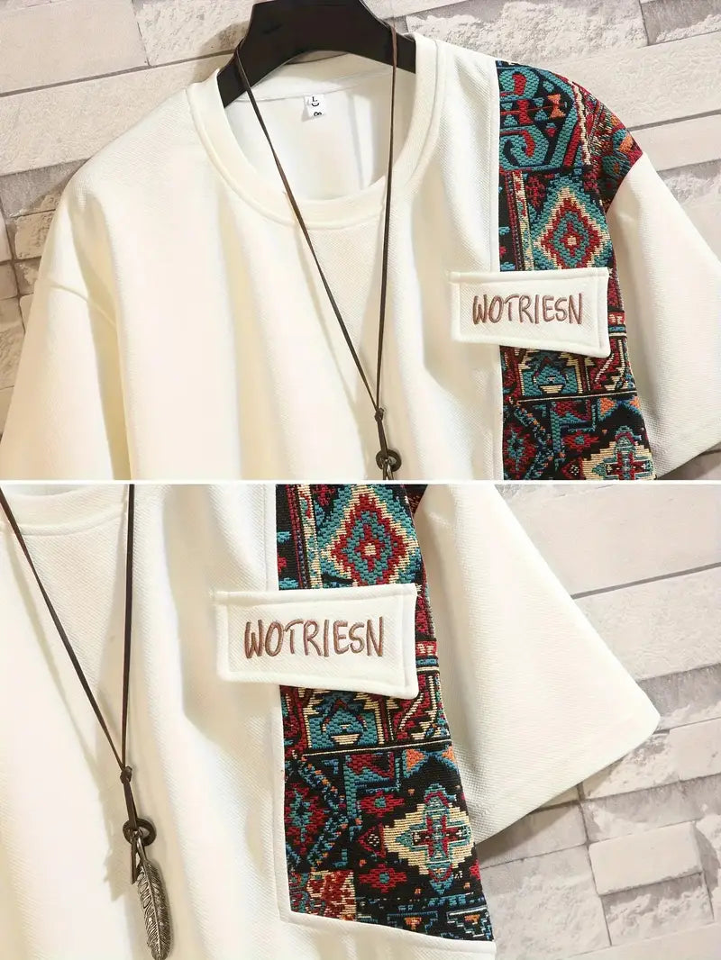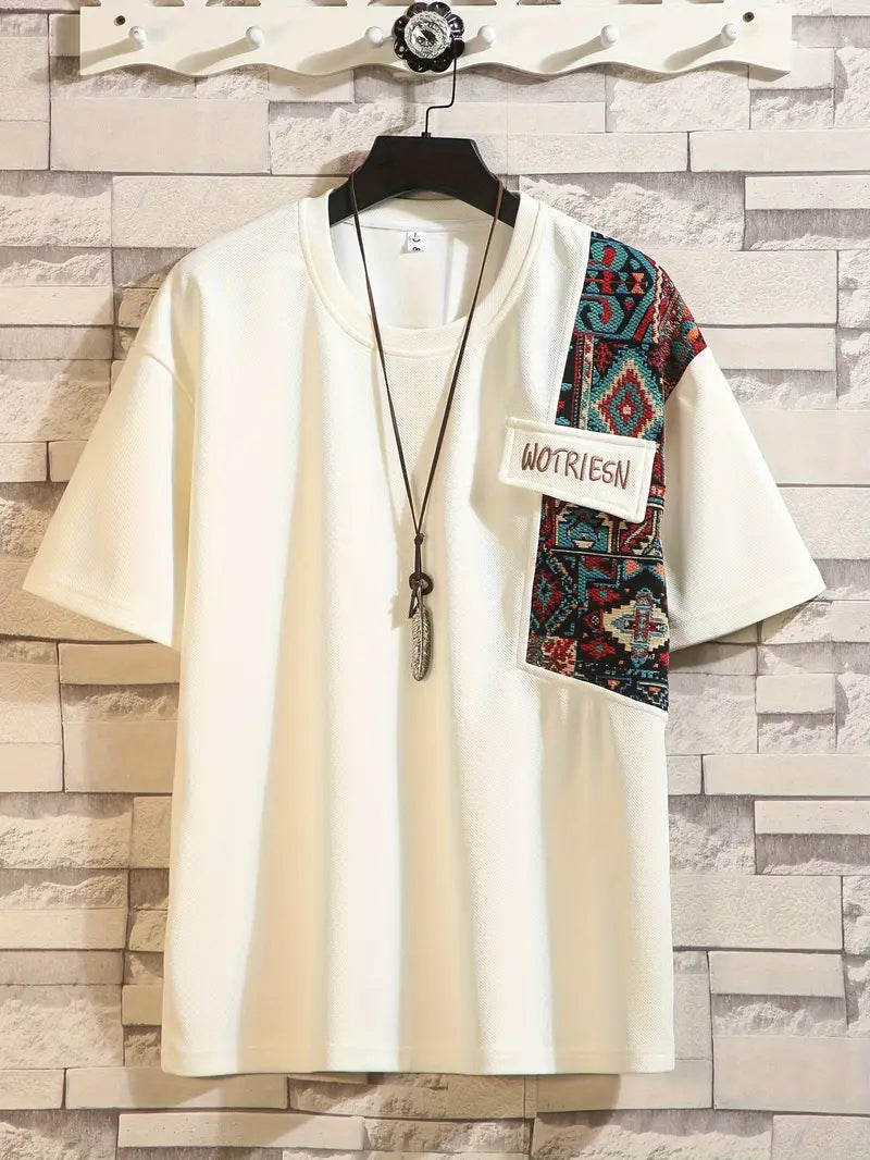 Less is more, but with an edge. This clean, ivory textured tee stands out with a contrasting Southwestern-inspired geometric pocket and sleeve detail. Elevate your everyday basics.