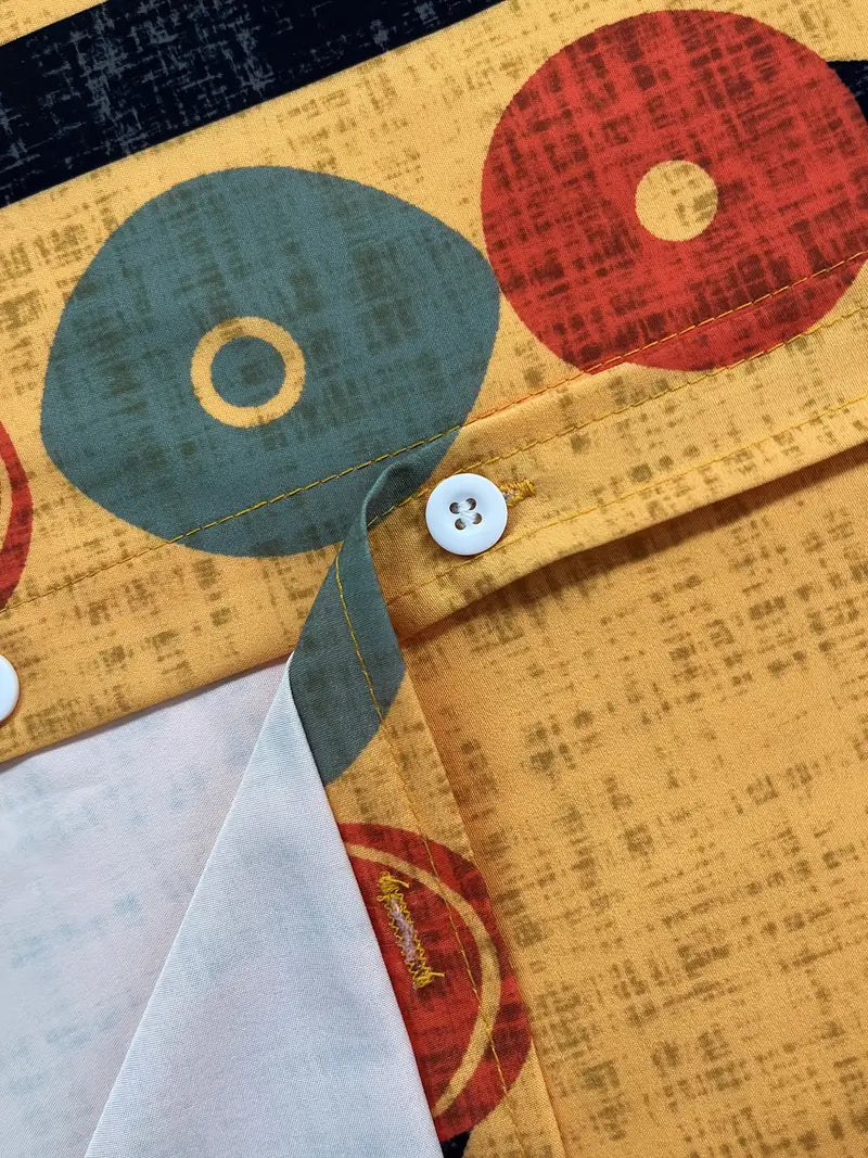 Sun-bleached ochre yellow with a commanding central panel of black and deep orange tribal totem graphics. This band-collar shirt is for those who step out to stand out.